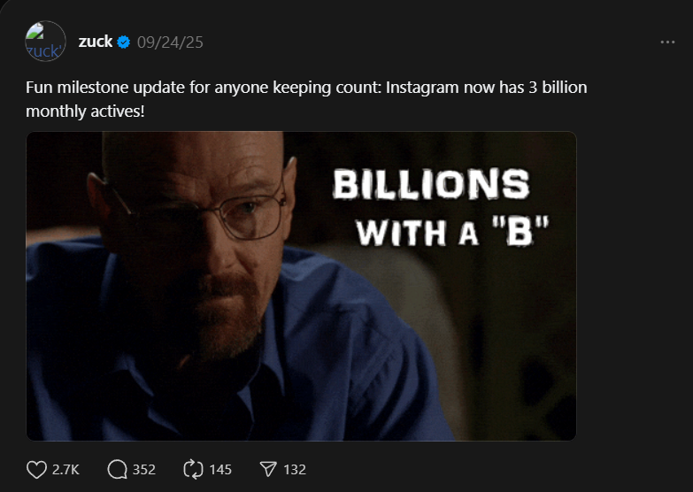 Instagram Just Hit 3 Billion Users: Here's What That Actually Means Three billion. That's billion with a "b," as Mark Zuckerberg emphasized this week with a Breaking Bad GIF on his Threads post. Instagram has officially reached 3 billion monthly active users, and honestly? It's kind of mind-blowing when you stop to think about what that number represents. That's nearly 37% of everyone on Earth. If Instagram were a country, it would be bigger than India, China, the U.S., and the entire European Union combined. No empire in human history, virtual or otherwise, has ever reached this many people this quickly. But here's the thing: while the headline number is impressive, the real story is about what Instagram is becoming and how it's changing to stay on top.